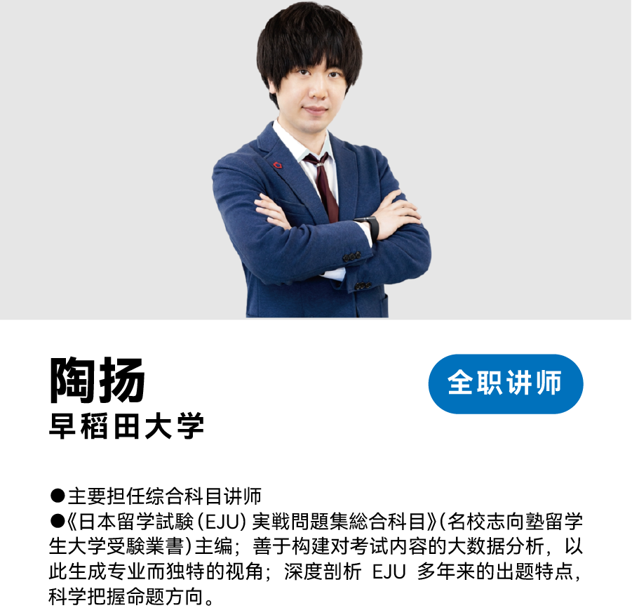 主要负责在校生零基础至日本留学考试文科类应试、日本各大学校内考文科应试与考前面试。三管齐下,因材施教,自成一脉。讲师全名校背景,上至哲学思想,下至人文语言,纵晓经纶济世,恒通人伦五常。在此基础上,平行穿插优质文科数学课程,如虎添翼。