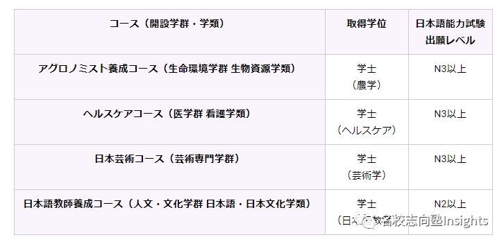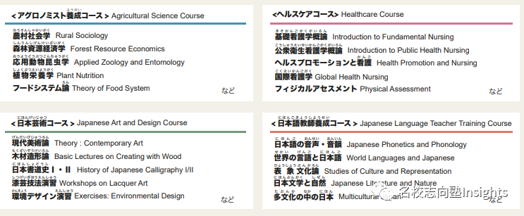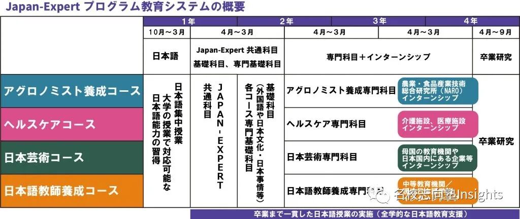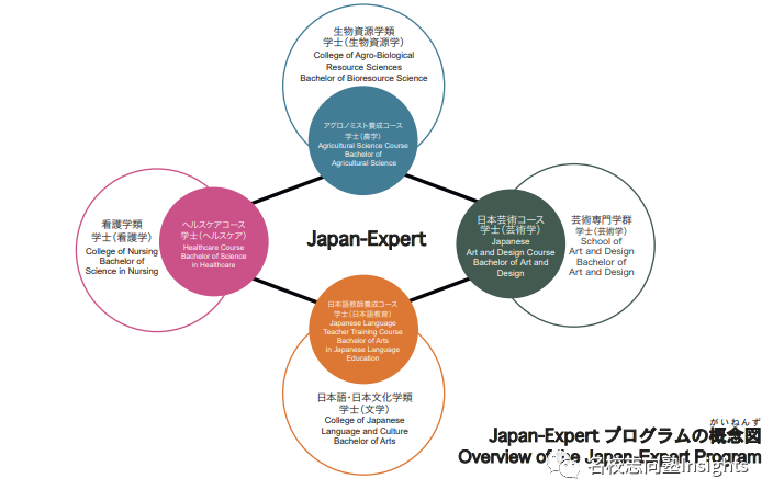 而为应对学生多样的专业选择,Japan-Expert项目下设有4个专业:日本语教育学(日本語教師養成コース)、日本艺术学(日本芸術コース)、看护学(ヘルスケアコース)、农学(アグロノミスト養成コース)。
