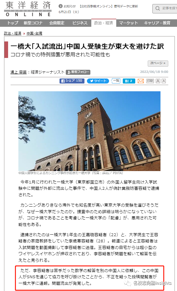 然而在诸多被提及的因素中,入试方式变更问题常被提及:在疫情前,评判考生的要素较为多元,涉及的考试种类也较多;而在一桥大学采取全校内考评价的形式后,一点集中型的涂卡式问题也将考试作弊的难度降低了不少。