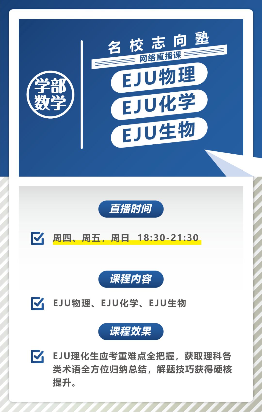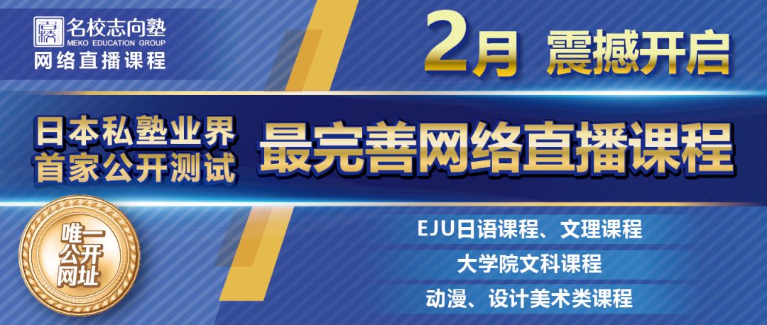 Q:湖北、浙江在留延迟发放,面临考学计划延后的考生应该怎么办? A:经过名校志向塾IT部门以及所有教研组的共同努力,在最短时间内火速完成网络直播平台搭建并完成公测。是日本私塾行业内唯一公布直播网址,(http://live.mekoacademy.cn/)并最早提出最完善的授课体系、以及最全面的授课内容的在日教育机构。目标是在最大限度内帮助受疫情影响的考生按期达成考学计划。 Q:名师直播课包括哪些科目? A:名师直播课包括日本语学校课程、EJU考学课程(日语、文综、理科、数学)、托福课程、大学院课程及美术类课程。其余课程目前正在积极筹备中,敬请期待。 Q:名师直播课有什么特点?学完可以有什么整体收效? A:完美针对赴日时间延后问题,结合历年教学经验和精准教研,实时规划最科学的远程考学方案,隔空投课,指导受地域限制的考生有效实现考学成效最大化,以最短的时间、最优化的知识体系,力争在来日后的EJU各科、日语能力考、大学院考试中打出会心一击。 Q:满足哪些条件可以免费领取直播课? A:名校志向塾全力支援疫情预备赴日学子,已为湖北地区同学开放免费的网络直播课通道,以保证顺利衔接渡日课程。现将免费范围扩大至浙江地区,以及所有受到疫情影响而不能及时赴日的同学们。