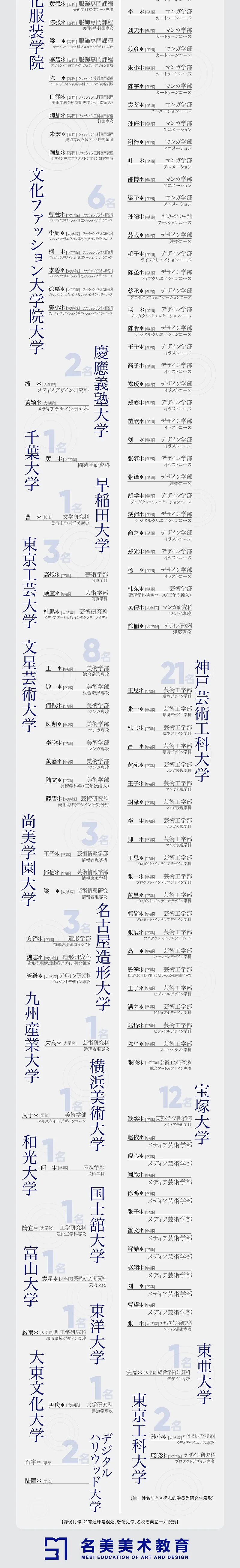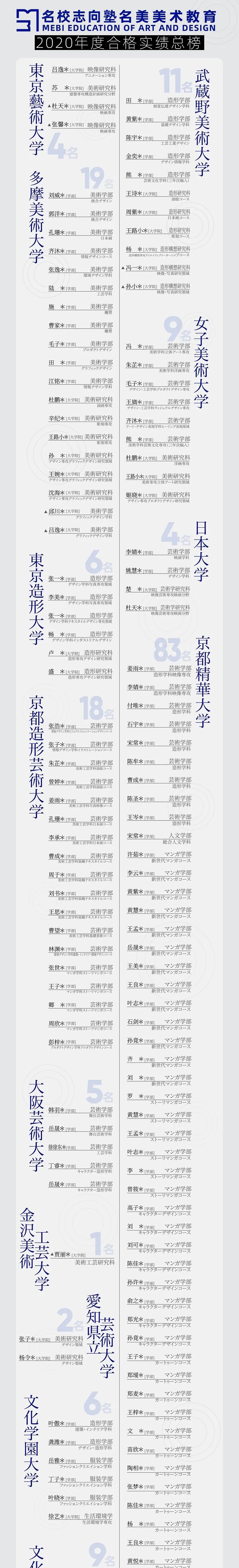 **合格实绩名单人名全部真实有效,无“補欠”者凑数。支撑这些的是不断更新的硬核教学实力和专业教研体系!众所周知,美术考学中,设计类专业人气最高,同时也难度最大。尽管如此,名美学员仍然势不可挡:如多摩美グラフィックデザイン学科、プロダクトデザイン専攻,武藏美視覚伝達デザイン学科、基礎デザイン学科、工芸工業デザイン学科、デザイン情報学科这样的高难度学科都涌现了大批的名美学员,合格者占总体合格人数百分比分别为63.2%、36.4%!其余“东京五美大”中,设计类合格者占比也非常突出:东京造型大学设计类合格比为100%,女子美术大学设计类合格比近一半,日本大学 · 艺术学部设计类合格者占四分之一!