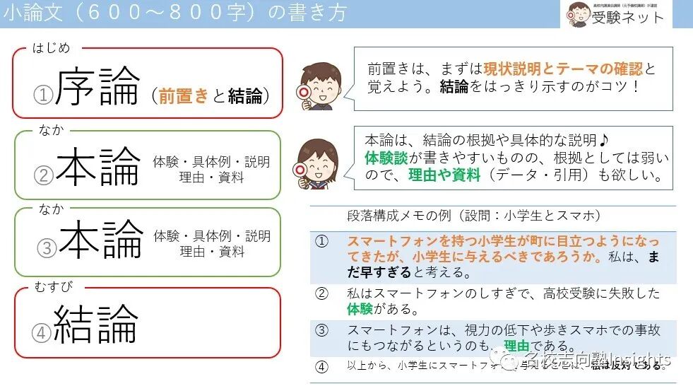 且在论述过程中,一般是以——论述自己意见(论点)→论据1→论据2→反论(批判性写法)→解决方法(最终结论)——这样的一个顺序来完成。