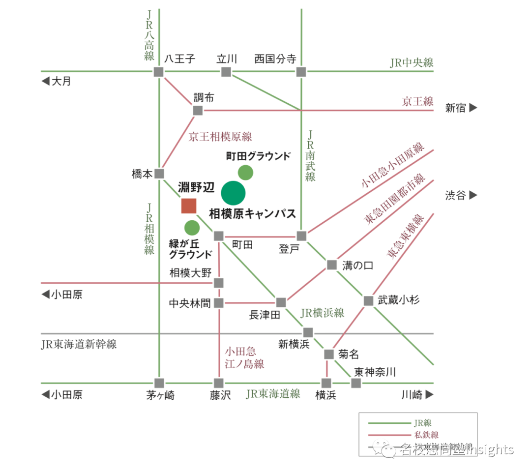 虽然相模原校区看上去似乎地处偏僻,但从access的角度来说还是不同于某些学校穷山恶水、还要电车转巴士的校区,交通还是很方便的——比如说,从最近的JR横浜線淵野辺駅前往大学只需徒步7分钟;校区周围也遍布通往东京各大换乘站的电车路线,且大多无需换乘。