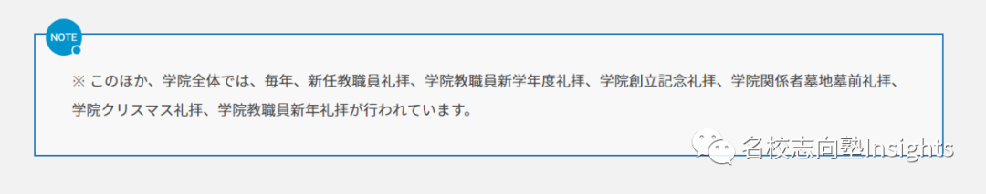 *野生翻译君出没:此外,每年还设有信任教员礼拜、学院教职员新学年礼拜、学院创立纪念礼拜、学院关系者墓地墓前礼拜、学院圣诞节礼拜、学院教职员新年礼拜。