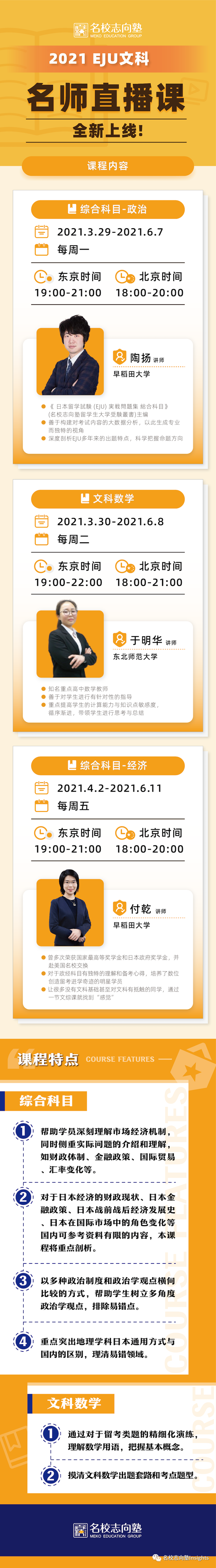 EJU文科直播课分为综合科目(文综)和文科数学两个部分。出身顶级院校、拥有丰富教学经验的文科组各位老师将带领大家厘清学习重点,将易错题各个击破。