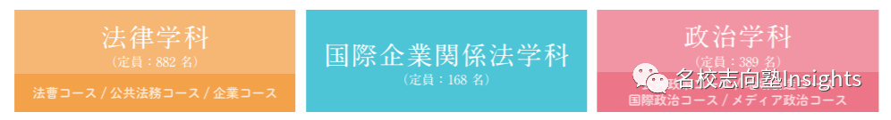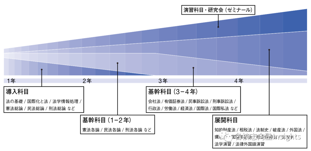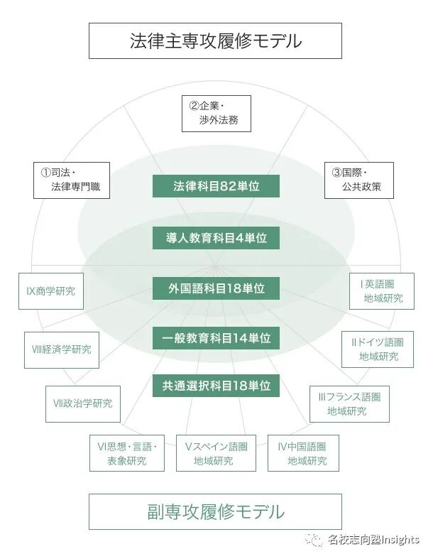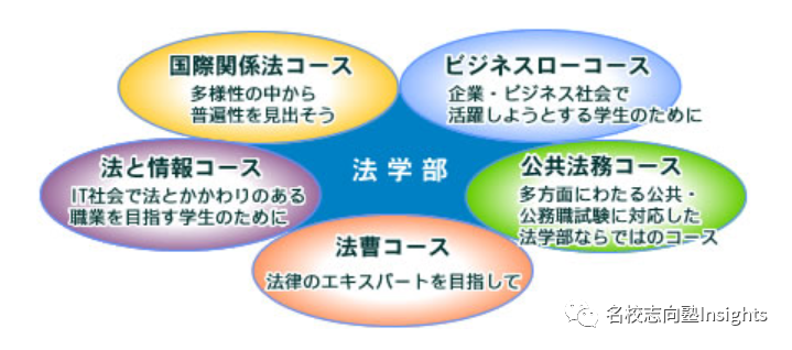 像是早大、明治这类仅设有法律学相关学科/course的法学部在专门科目上方向性比较明确,“法学一本筋”。