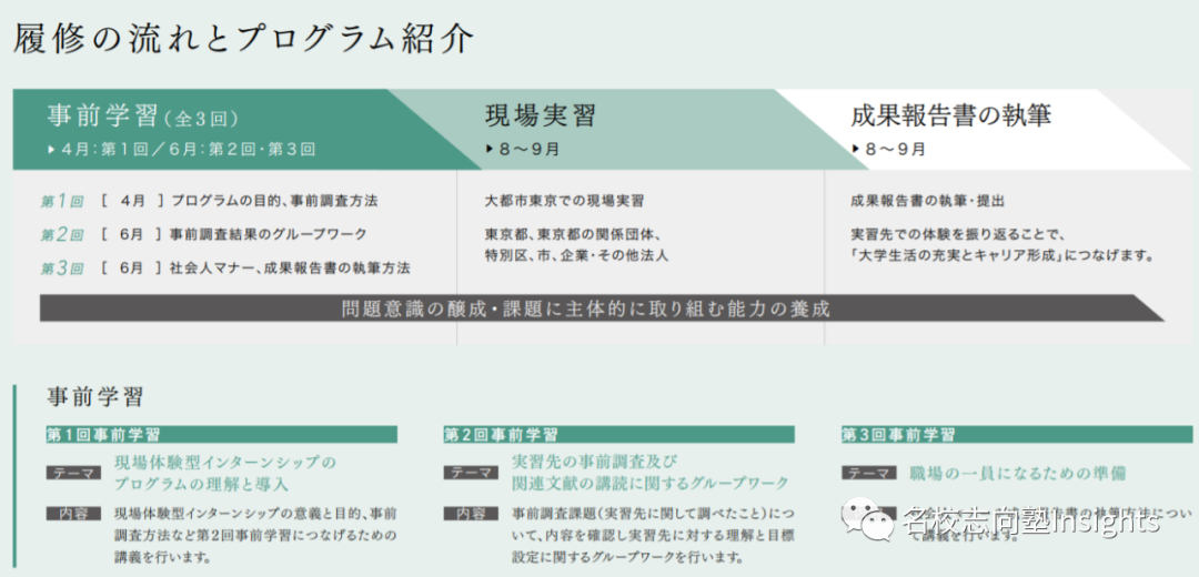 比如说,现场体验型实习(現場体験型インターンシップ)课程,主要面向1、2年级学生,整个课程分为事前学习、现场实习和成果报告书执笔3个阶段,学生可通过履修该课程获得在东京都内企业、法人及关系团体等的机会,从而收获宝贵的实习经验。