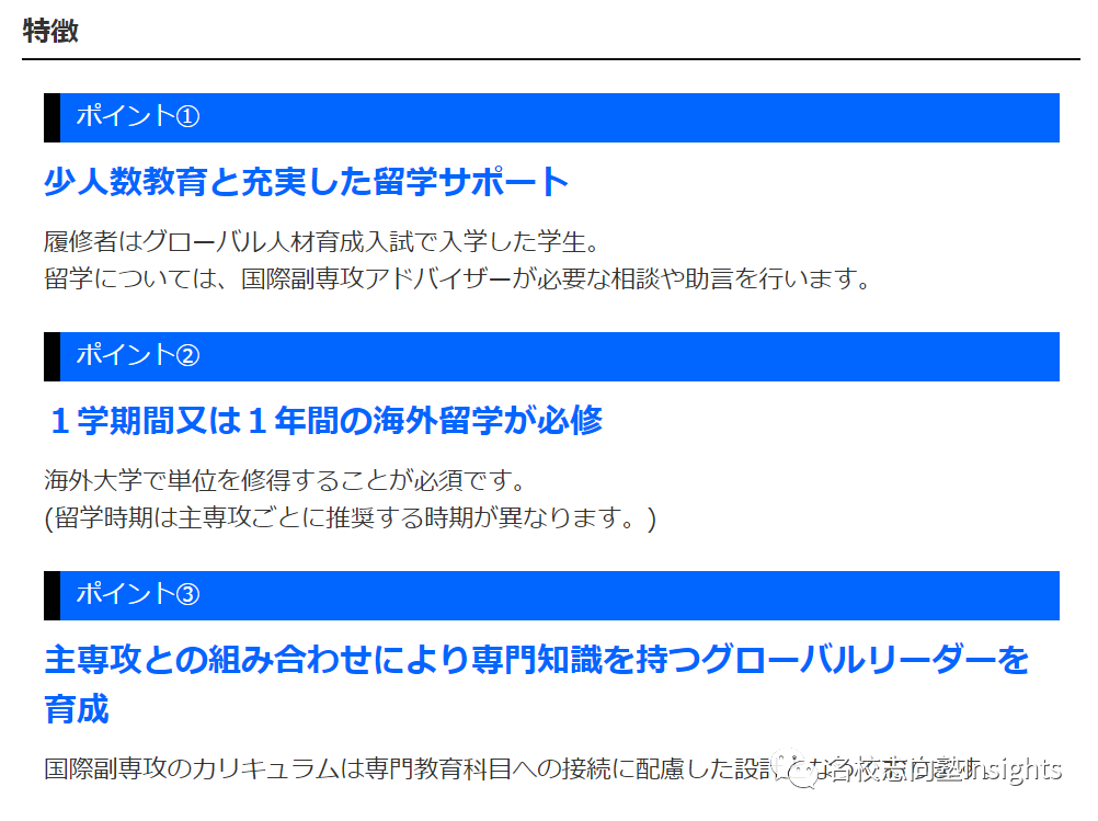 其中,国际副专攻course以グローバル人材育成入試(AO入試)合格者为对象,在必修科目中设有海外留学,算是个精英项目。