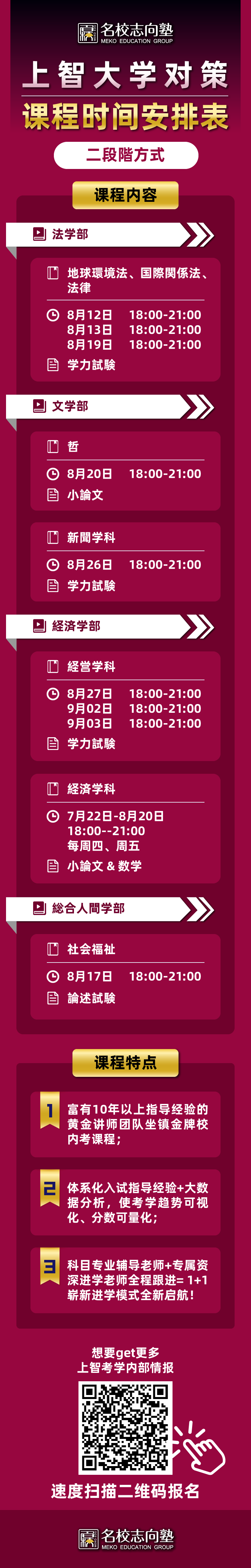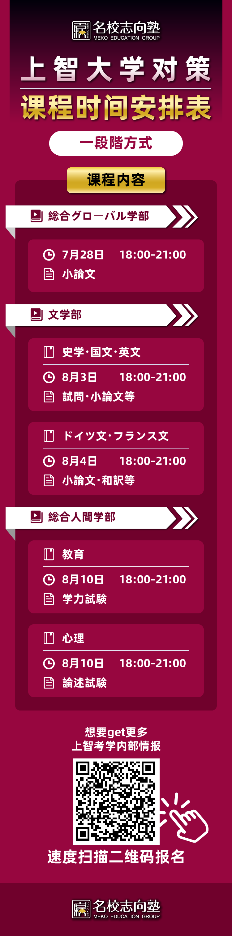 名校志向塾即将重磅推出上智大学校内考宣讲会+集训课程,计划报考上智的各位一定不可错过⇣⇣⇣