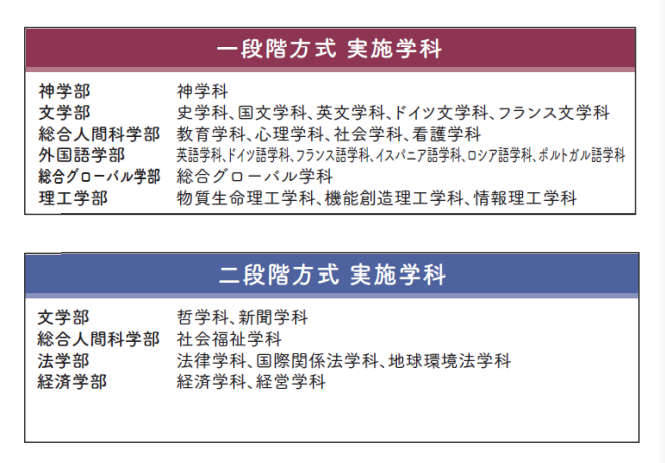 具体学科试问内容: -神学部:外国语(英语、德语、法语、西班牙语、意大利语任选其一)+小论文 -文学部(哲学科、史学科):专门科目相关的口头试问 -文学部(国文学科):古文/汉文相关笔试+小论文 -文学部(英文学科):日英互译 -文学部(フランス文学科):英译日或法译日 -文学部(ドイツ文学科)、法学部、グローバル学部、外国語学部(ドイツ語・ポルトガル語学科・ロシア語)、総合人間科学部(社会福祉・看護学科):小论文 -文学部(新聞学科):journalism相关的基础学力测试 -経済学部(経済学科):数学+小论文 -経済学部(経営学科):产业社会相关的学力测试(含英语) -総合人間科学部(教育学科):教育学相关的基础学力测试 -総合人間科学部(心理学科):课题文相关论述 -総合人間科学部(社会学科):文章理解、表现、思考相关试问 -外国語学部(英語学科):英文解释+听力理解、时事教养问题相关的英文作文 -外国語学部(フランス語学科):小论文+日语听写 -外国語学部(イスパニア語学科):日语读解力及表现力相关试问 -理工学部:无学科试问