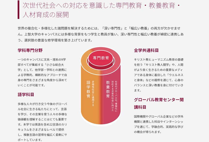 上智大学在教学方针上,沿袭了众多欧美大学中重视基础教养教育(リベラル・アーツ,也称作“自由七科”):学生除了所属的学部及专攻以外,也可以自由的选择其它学部及专攻的课程。