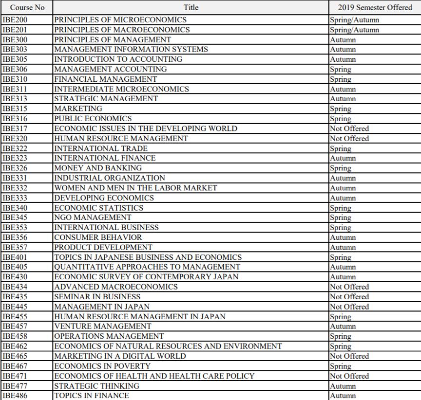 IBE计划允许学生自由发展广泛领域中所需的强大技能。学生首先通过修读微观经济学,宏观经济学,管理,市场营销,会计和统计学的基础课程来打下坚实的基础。在此基础上,通过国际贸易,国际金融,财务管理,产业组织和消费者等课程,获得自己感兴趣的领域的高级知识和技能。