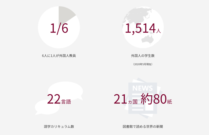 同时,也不负其在日本国内的别名“英语の上智”,除完善的英语教育系统外,对于学习,研究中所必须的语言能力培养,在上智大学中可学习的22种语言,可完美对应绝大多数的需要。