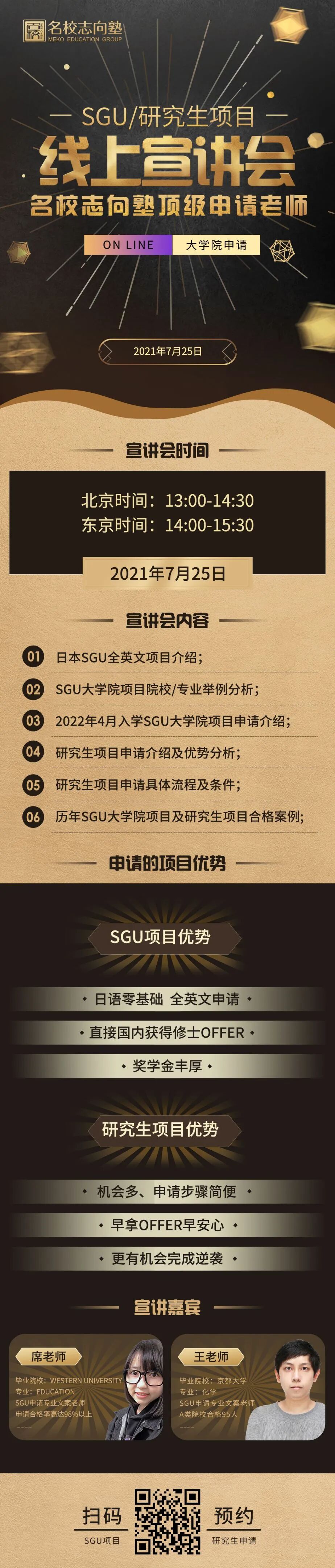 7-8月正逢日本顶尖学校SGU项目出愿高峰期。为此,我们特别请来了辅导众多同学通过该项目进入心仪院校的名校志向塾资深SGU项目顾问老师们,为大家深度讲解SGU大学院项目详情与报考策略,在夏季考试季前知己知彼百战百胜!