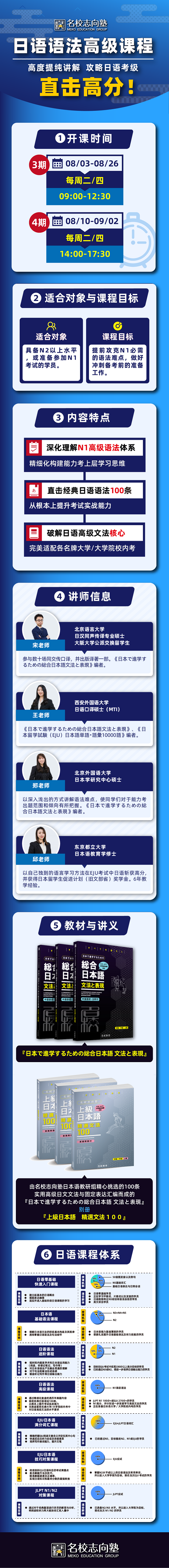 该课程适合具备N2以上水平,准备参加N1考试的学员。该课程的专属老师将带领大家攻克N1必需的语法难点,并完美适配各顶级大学/大学院校内考核心,做好冲刺备考前的一切准备工作。