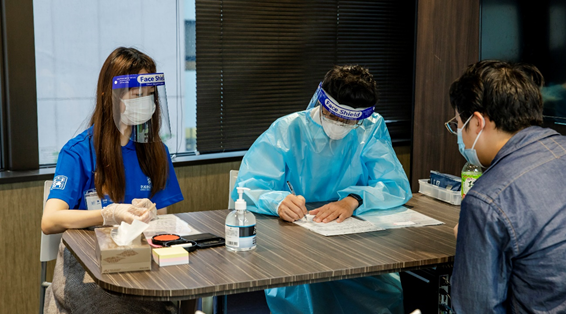 本次免费接种工作严格遵守防疫规则,在场的全员全程佩戴口罩。在入场前师生们保持社交距离有序排队入场,在接种前自觉接受测温和消毒,听从工作人员安排,现场的接种工作安全、有序地进行着。因防疫需要,符合条件的接种人员分成上午10:00-12:00 和下午 13:00-18:00两个批次参加接种,以每小时为单位划分时间段。本次接种全部由内科医生及相关医务人员现场提供专业的问诊及接种服务,确保参加接种的人员可以在最正规化的流程下进行疫苗接种。为保证疫苗接种工作顺利进行,名校志向塾特意将学校的三层全部留出来为接种工作服务。在宽敞的空间里,接种工作进行得非常迅速且有序。在接种现场,工作人员耐心为每一位同学仔细解答疫苗的相关事项。配合中文老师们的翻译和讲解,每一位接种者安心地接种了疫苗。接种后,为确保没有出现与接种有关的不良反应,接种的师生们在教室的接种点观察15分钟后依次有序离场。本次接种目前没有出现反应非常激烈的接种者,个别出现轻微不良反应的同学也在延长观察时间后有所好转,安全离场。