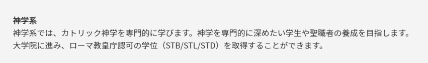 先来说神学部,对于非天主教背景的同学,笔者的建议都是不要尝试。上智大学仅对留学生开放神学部神学系,该系定位明确,基本是为了培养神职人员或者神学专门人才的。因此它对前来报考的学生具有比较高的宗教素养上的要求,基本不是“我看了神学解说书”之类普通水平的宗教爱好者能贸然出手的对象。并且,在神学系大学院毕业后,学生能获得罗马教皇认证的学位,可见其专门性之高。
