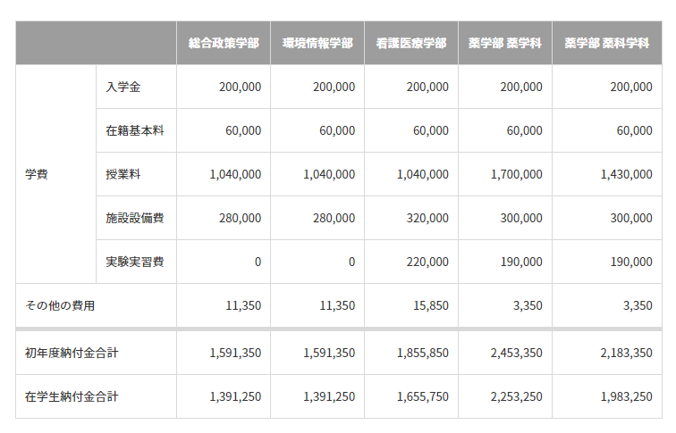 其次,这样一个理工科类的学部,学费还比同校的理工学部要低。参照2021年度的学费情况来看,环境情报学部的学费每年平均比理工学部低了20-30万日元不等。可别小看了这些费用差,四年下来积少成多基本能相当于国立大学两年的学费。并且,环境情报学部位于湘南藤泽,该地区生活费也比理工学部的港北区低不少。
