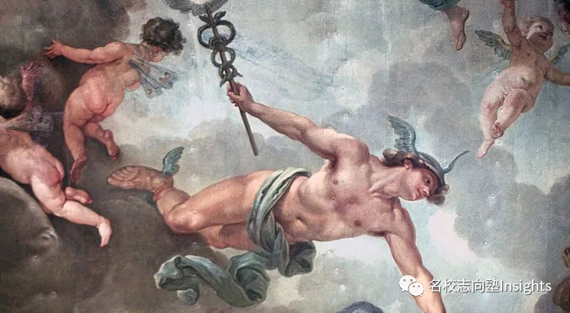 传说罗马神话中商业与学术之神的墨丘利,手持双盘蛇带翼权杖,头戴翼帽,脚踩插翼凉鞋。因此在几乎所有以他为题材的衍生logo中,双蛇与双翼基本是绕不过的王道。