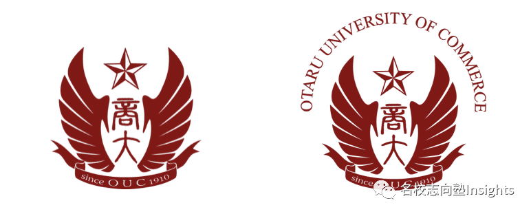 如今这一版的小樽商科logo制定于1998年10月1日,由商业之神赫耳墨斯(墨丘利的希腊神话版本)的双翼与五角星、书写着“OUC创立于1910年”的丝带所组成。简称为“赫耳墨斯与一星”。