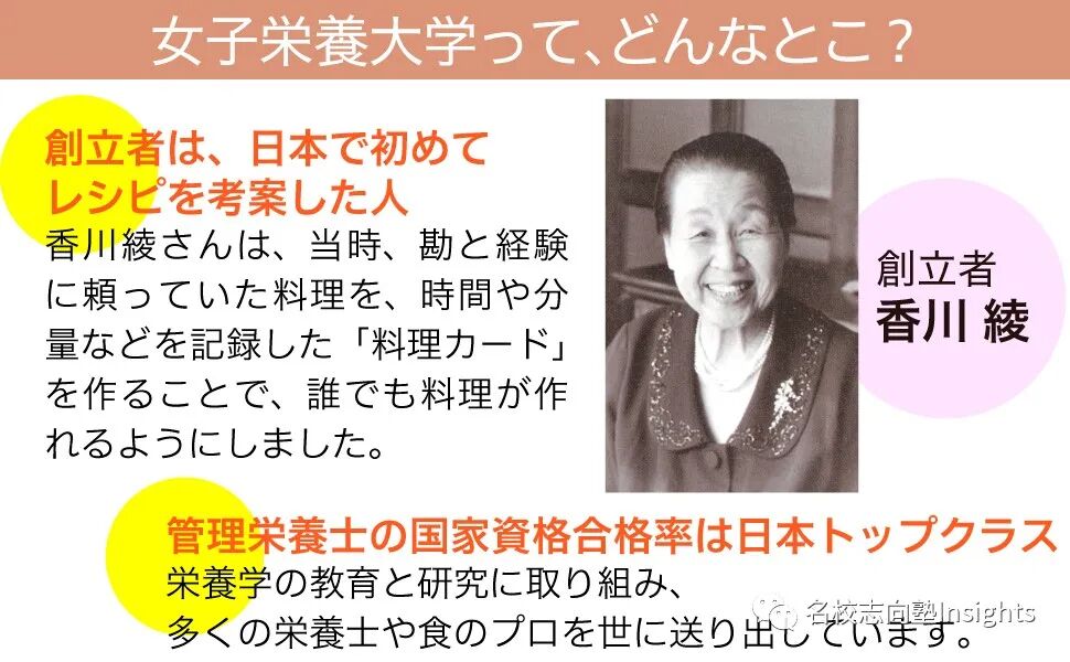 初看到这个校名时,笔者也不禁沉思——这难道就是传说中的女子版新东方烹饪学校? *女子栄養大学 女子栄養大学正式成立于1961年,但前身却可以追溯到1933年的“家庭食養研究会”。创立者为日本医学博士香川綾,她对日本的“食文化”做出了非同寻常的贡献。她不仅凭一己之力,极大地提高了营养学这门学问的社会地位。同时,也通过改良日本家庭中常见的量杯,量勺等“調理用計量器”,让曾经难以把控的调味料之奥秘,飞进了寻常百姓家! 从此,各种料理节目、食谱等,在日本的各大电视台以及书店,如雨后春笋般出现在了大众的视野中。这也间接地丰富了日本人的饮食文化。 *香川綾简介 而作为改革据点的女子栄養大学,说是日本营养学的中心也不为过!该校深耕于营养学领域,不仅设立了学部,更是罕见的在营养学领域设立了修士以及博士后期课程的学校!并且,该校每年拿到“管理营养士”国家资格的学生为全国最多,对于学生的学习状况有着严格的监管。 *学校法人香川学园旗下学校 同时,根据日本著名辅导机构河合塾的数据,女子栄養大学実践栄養学科的偏差值,达到了55!作为一个单性别校,且是一个冷门专业的单科大学,入学难度竟然能与著名的“日东专驹”齐平,其人气及社会认可度可见一斑。 最后说到考学,虽然这所日本营养学殿堂级大学,承认外国留学生入学,但是条件相对苛刻:只承认女性入学自不必说,且考生需要有一名在日并持有日本国籍或者拥有永住权的保证人。
