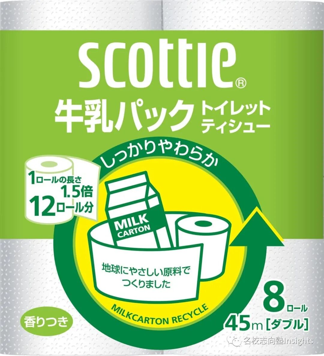 Scottie的牛奶盒系列,从纸芯到厕纸都采用了回收的牛奶盒。充分利用牛奶盒原料的特性,在保证100%环保的同时,也做到了其他再生纸浆无法企及的柔软舒适。