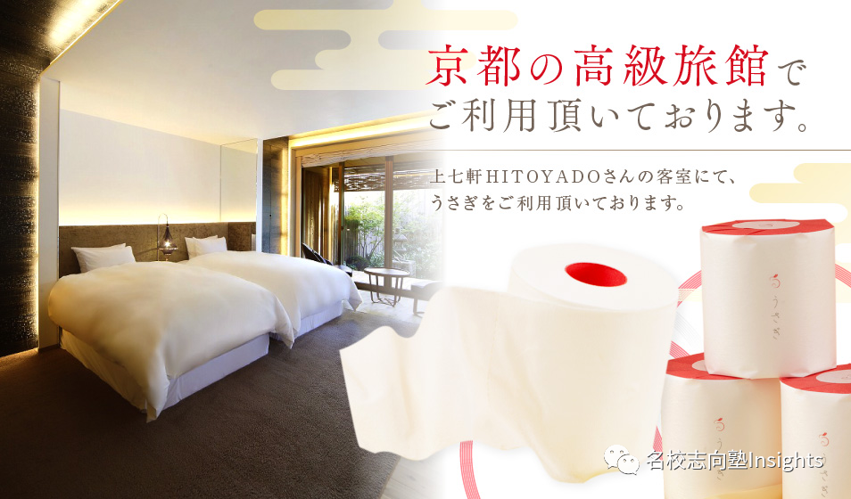 作为自用高级品的顶流,うさぎ除了达官贵人定期购之外,也时常出现在京都的高级酒店中。例如有名的上七轩HITOYADO就在所有客房采用了うさぎ厕纸: