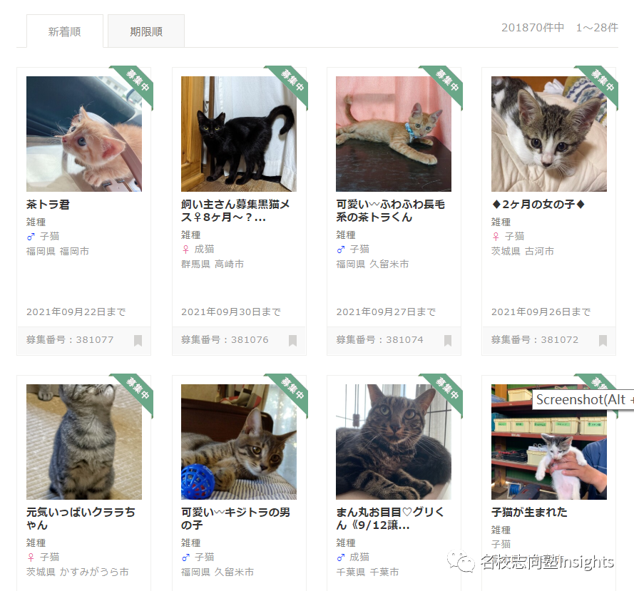 日本在猫咪的领养方面十分发达,有各种各样的领养网址,看上一只喜欢的猫后就可以和主人沟通,要是主人同意了,你就可以免费拥有这只小猫咪了。