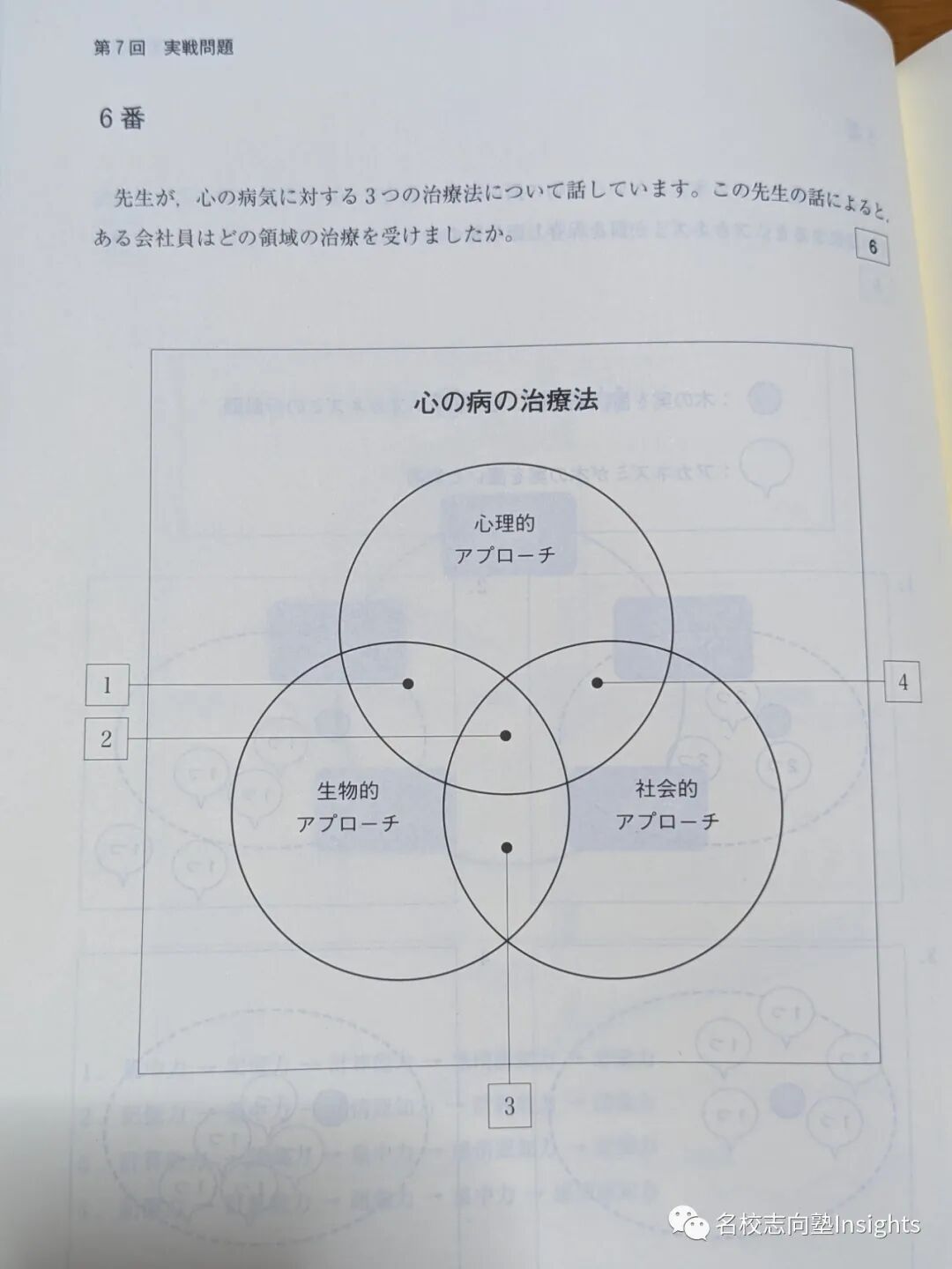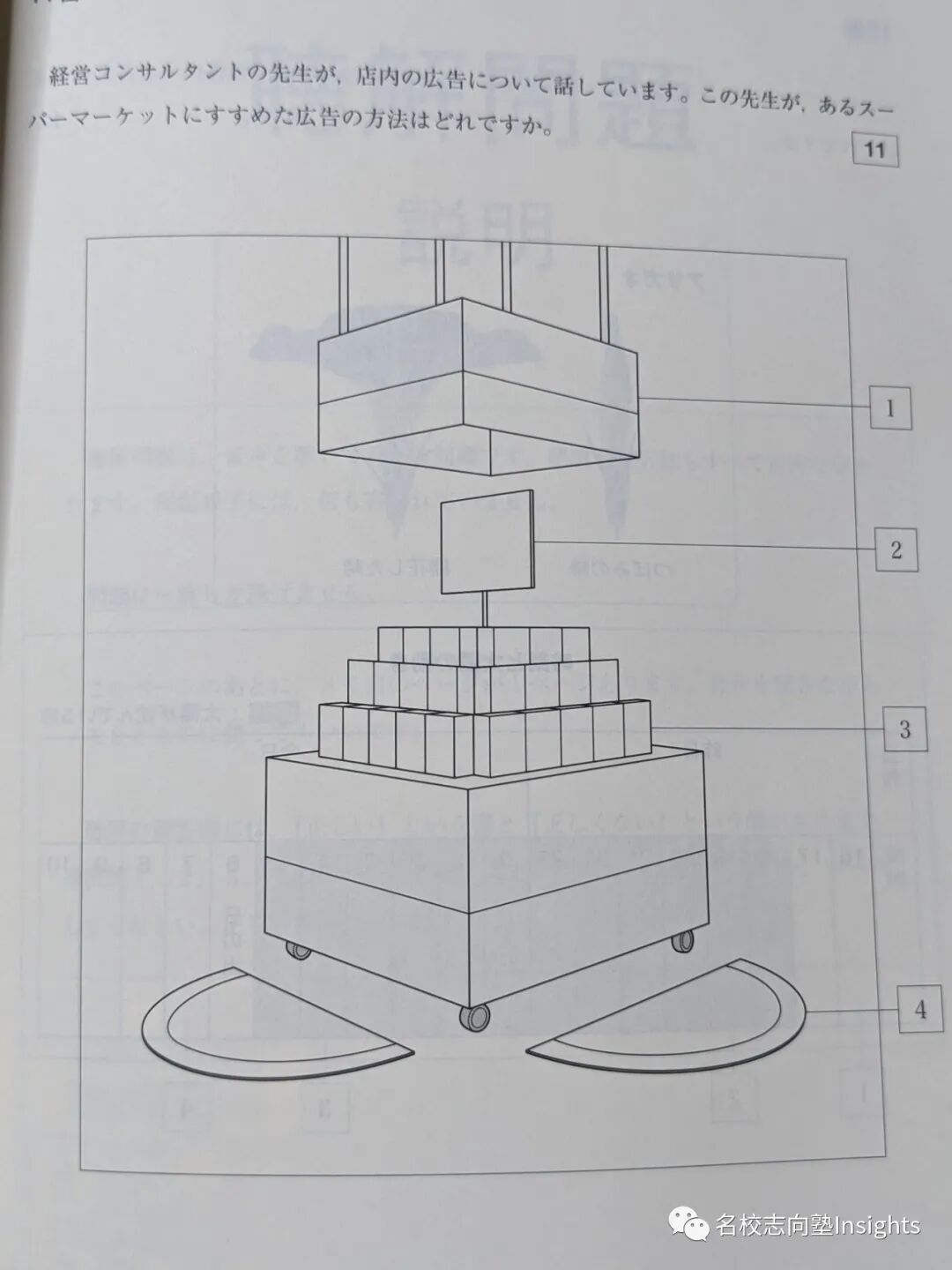 听读解部分难度设置有所区分,有约三四道题对学生能力要求较高,不但要捕捉到全面信息,还需要同时进行思考分析。一上来第一道题四个区间来回一讲,我已经不认识“便”这个字了。而在考场观察也可以发现,大部分同学都是等到下一道题开始读题了,才恋恋不舍地“哗”地一声翻过卷子,真的很难受。这个情绪一直持续到那道讲电车广告的题,如果做过名校志向塾前年出版的模拟题第一册第六套的同学,应该感觉非常熟悉(图一)。