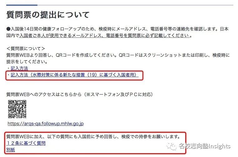 首先,大家需要扫描上方二维码打开质问票。其次,打开并参照红框标注的“记入方法”,根据厚生劳动省的指示一步步完成填写。