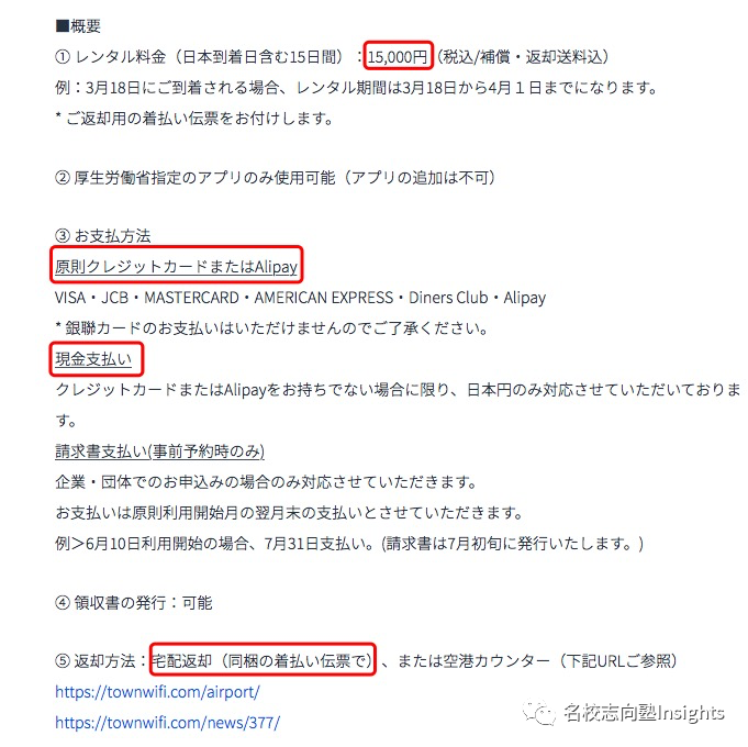 租借15天内的租金是15000日元(包含税费和返还所需邮费)。个人租借时可用现金、信用卡和支付宝进行支付。
