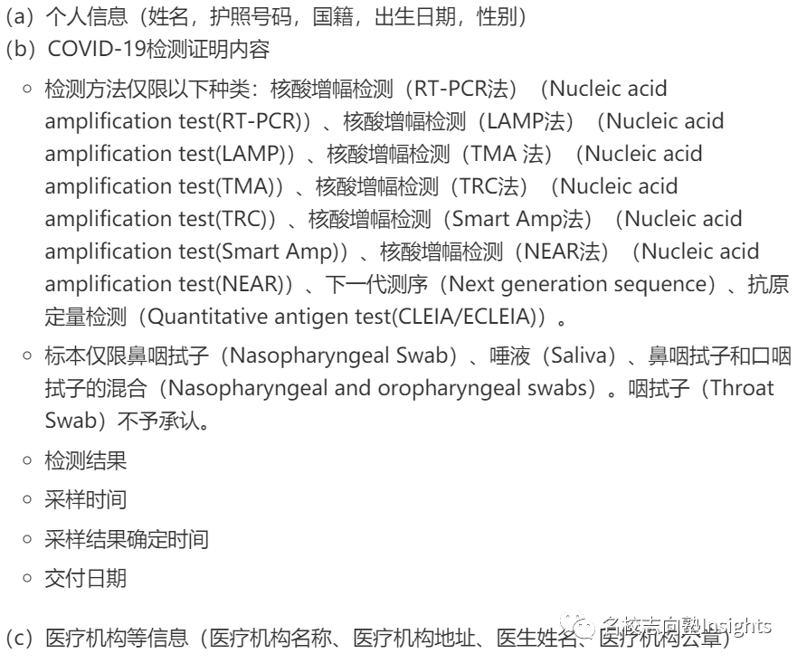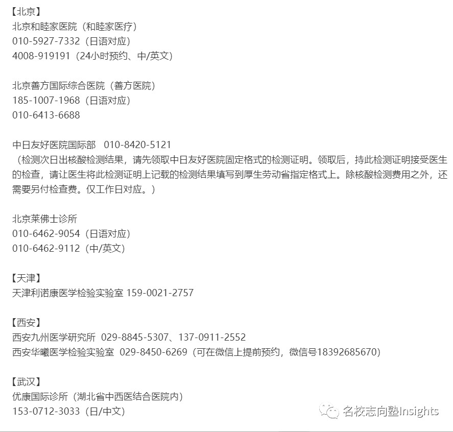 而对于虽不能出具厚生劳动省指定格式的检测证明、但可以出具包含全部厚生劳动省要求的“检测证明应记载内容”的检测证明的医疗机构,日本驻华大使馆也例举了部分,并再次强调: