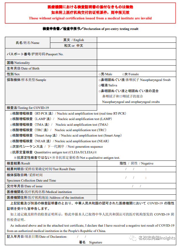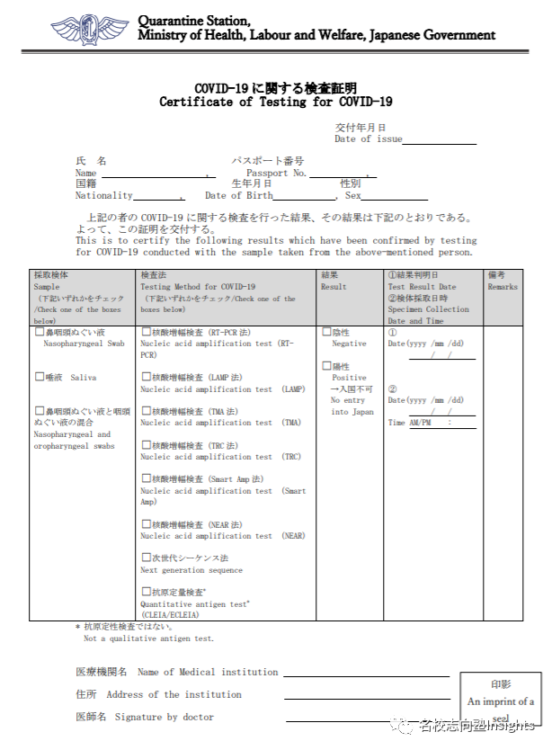 在预约检测时,还务必与医疗机构确认是否能出具厚生劳动省的指定格式,并告知医疗机构该证明将用于入境日本,以确保格式正确;