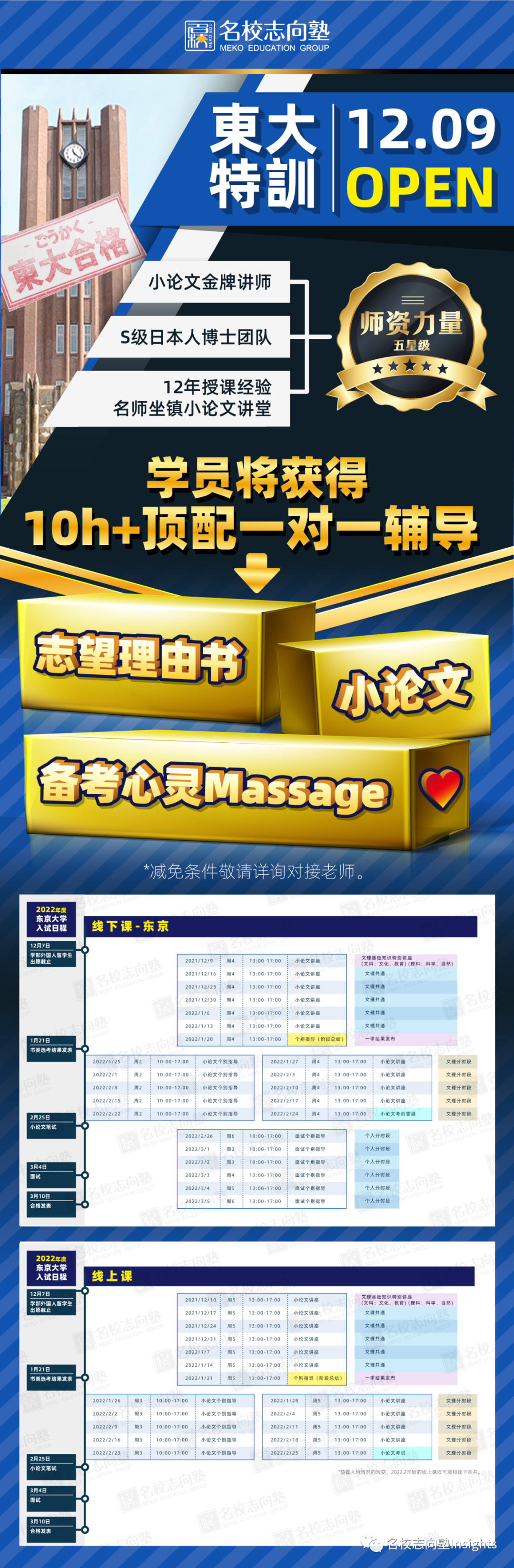Q:大批考生没有EJU成绩/无法及时入境的当下,东大的筛选标准真的和往年一致? A:本届东大第一次选考依然以志望理由书+EJU成绩+英语成绩等为主;校内考则维持小论文+面试。疫情之中确实有EJU/英语成绩考试机会少,难以拿出满意成绩的情况。这时候,你的志望理由书尤为关键。东大特训班中日资深教师团队将为你彻底理清专业选择思绪,塑造真正强有力的志望动机! Q:疫情之中校内考是否会有特定偏向性? A:其实,东大校内考中,多的是你不曾想到的“秘密”。名校志向塾多年来潜心研究东大校内考题库,独家研发的校内考特训将带你制霸考学,直击合格! Q:以地狱难度著称的东大校内考,我该如何脱颖而出? A:这个问题因人而异。每一位考生各有所长,不必畏惧自己的短板,只要准备得当扬长避短,必定能够展现出你独有的风采。东大特训班为每一位考生量身定制备考计划与训练模式,帮你科学发掘并亮出自身核心优势!