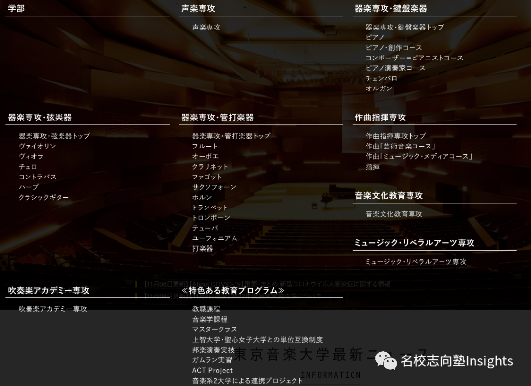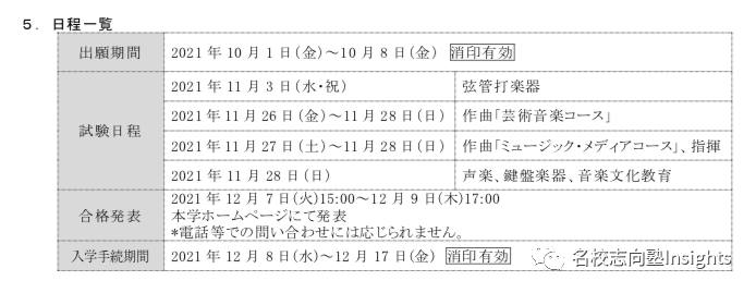 最后来说说东京音乐大学的考学。该校除了音乐教养专攻和吹奏乐学术专攻之外,留学生均可以报考。虽然2022年入学的出愿已经结束,但志望东音的同学们可以根据下方出愿与考试日程进行简单的参考,为今后的考学做好准备。