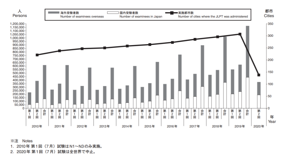 根据JLPT主办方的官方信息,2020年第二次JLPT的考试情况为: