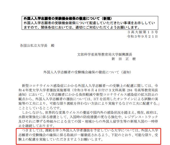 对此,文部科学省下发了文件,要求各大学针对由于奥米克戎引起的边境对策采取措施,大学们也都积极做出响应,例如通过利用ICT进行在线考试等方法,给入学志愿者无需出国的考试机会;例如实施追加考试,各大学不得征收应对疫情的追加考试费以及即使在追加考试中出现的合格学员超出学校的定员,也可以特殊处理进行招收。这些措施希望可以为我们的留学生们带来一些慰藉。