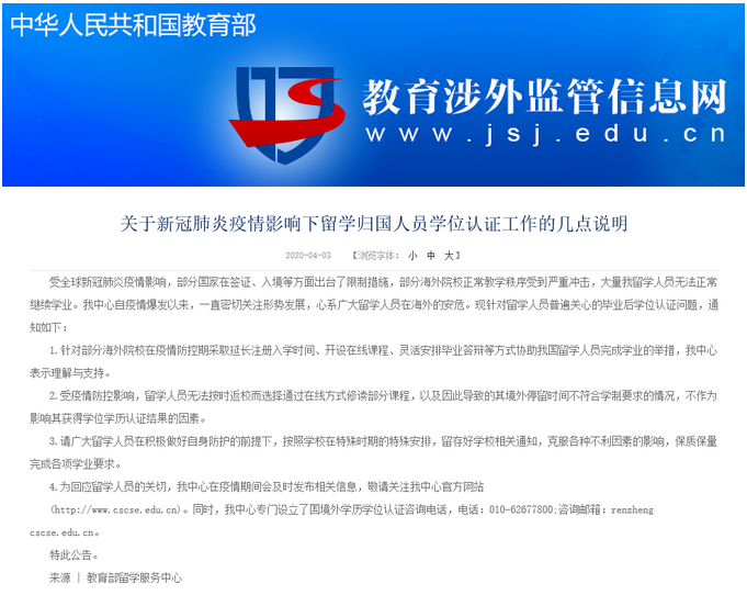 还有很多学生担心的网课学历认证问题,【教育部留学服务中心】已明确表示:对于受疫情影响,被迫选择通过在线方式修读部分或者全部课程的留学人员,在满足海外高校规定的学位授予条件后,其所获得的学位可以获得正常认证。