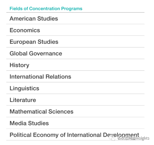 Concentration Program是为不满足于广泛的学际性学习的学生提供的、针对某个具体领域进行针对性学习的项目。该项目的专门分野包含美洲研究、欧洲研究、语言学、数理科学、媒体研究、国际关系等。