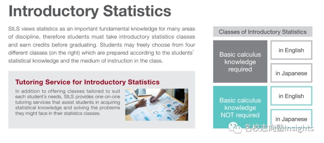 同时,SILS还设有统计学概论(Introductory Statistics)这一必修课程,根据学生是否具有统计学基础及语言能力,SILS设有4种统计学概论,而为了对应不同水平学生的需求,SILS还设置了指导环节(Tutoring Service),帮助学生巩固统计学知识,可以说是十分周到。