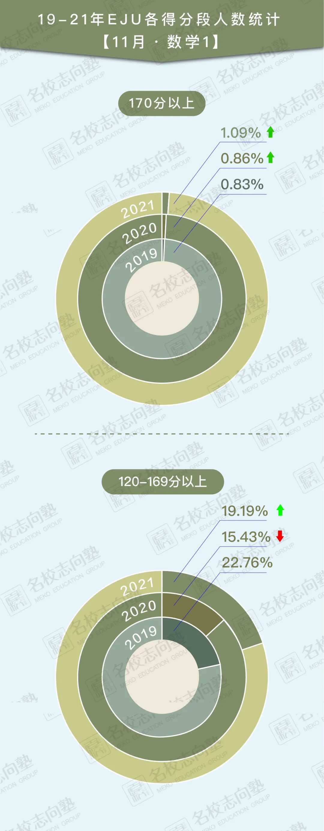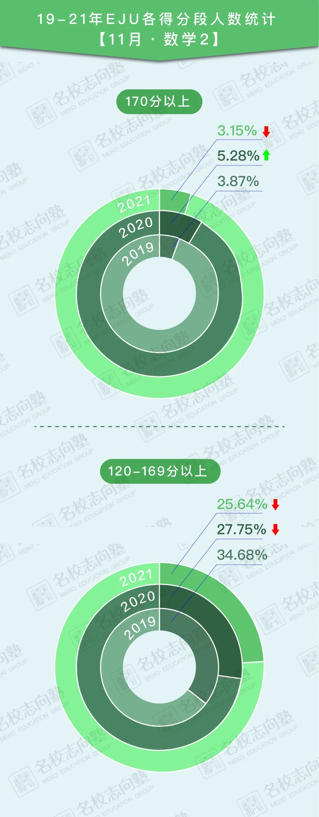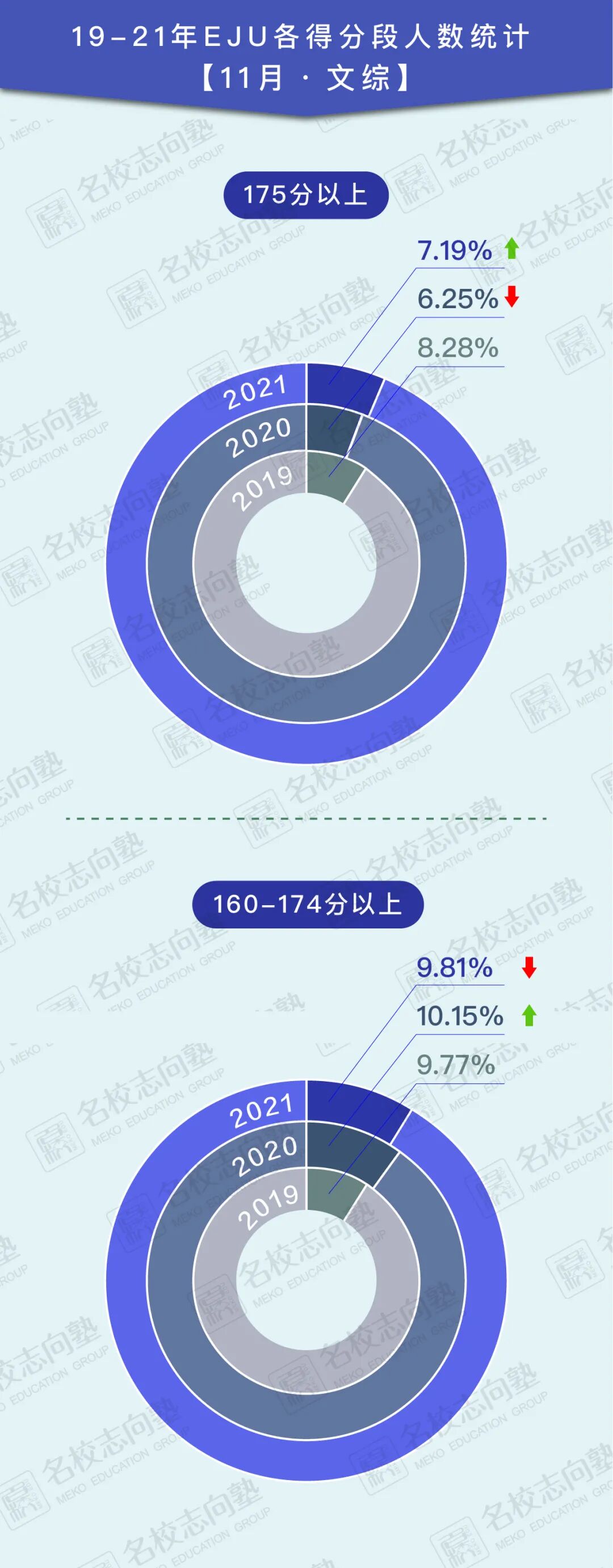 这与前几年我们观察到的“中等分数段人数减少”这一倾向有着明显的连贯性,换而言之,近年来取得日语高分的考生越来越多,这也给我们敲响警钟:日语能力的优势不复存在,考生在留考中取得日语高分逐渐成为“标配”,在注重日语学习的同时未来的考生也需要在文综、理综、数学科目中花费更多精力才能从众多考生中脱颖而出。