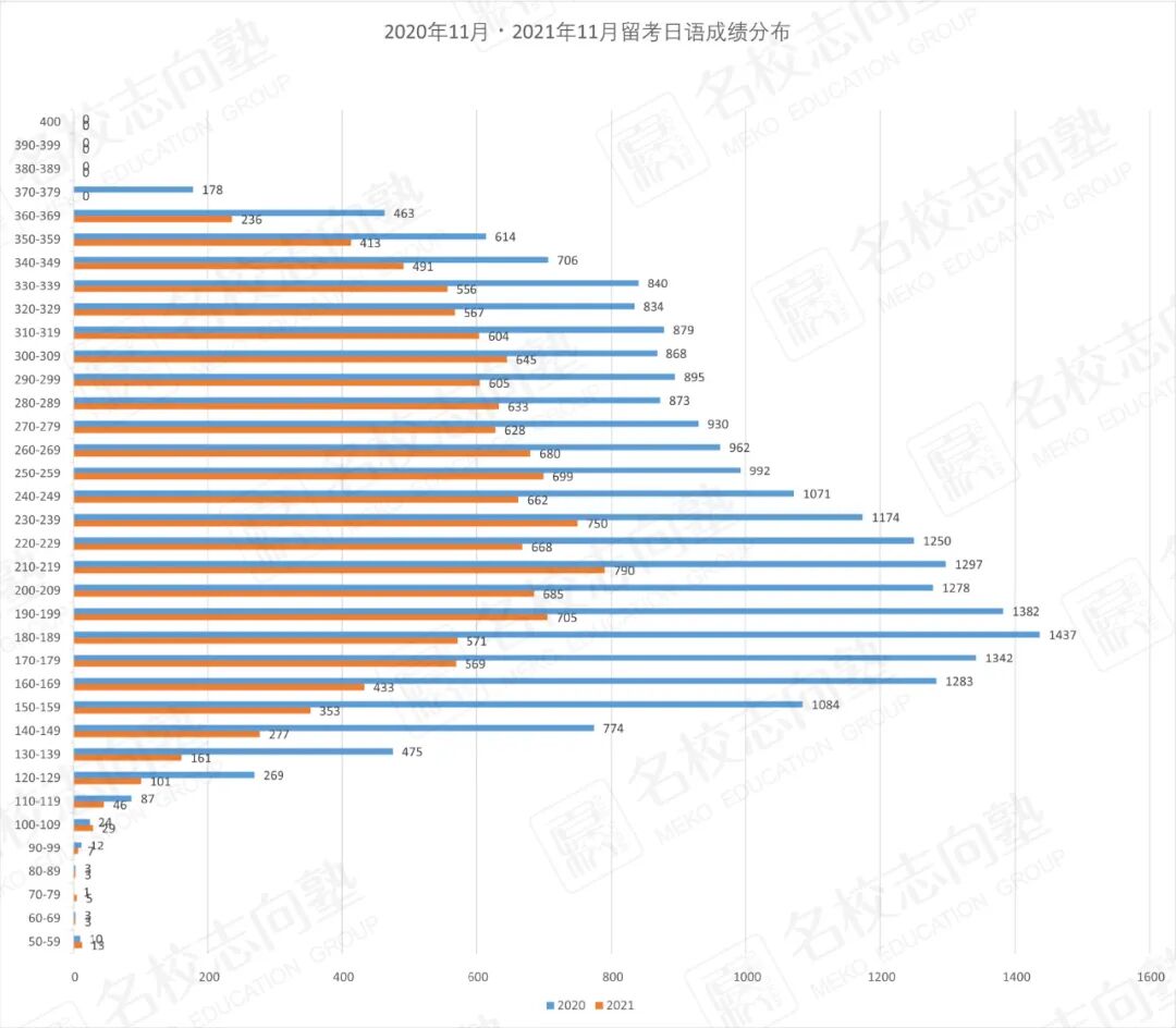 对比2020年11月和2021年11月留考日语的成绩分布可以发现,“150-240分的中低分层人数集中”这一现象正在逐渐消失。