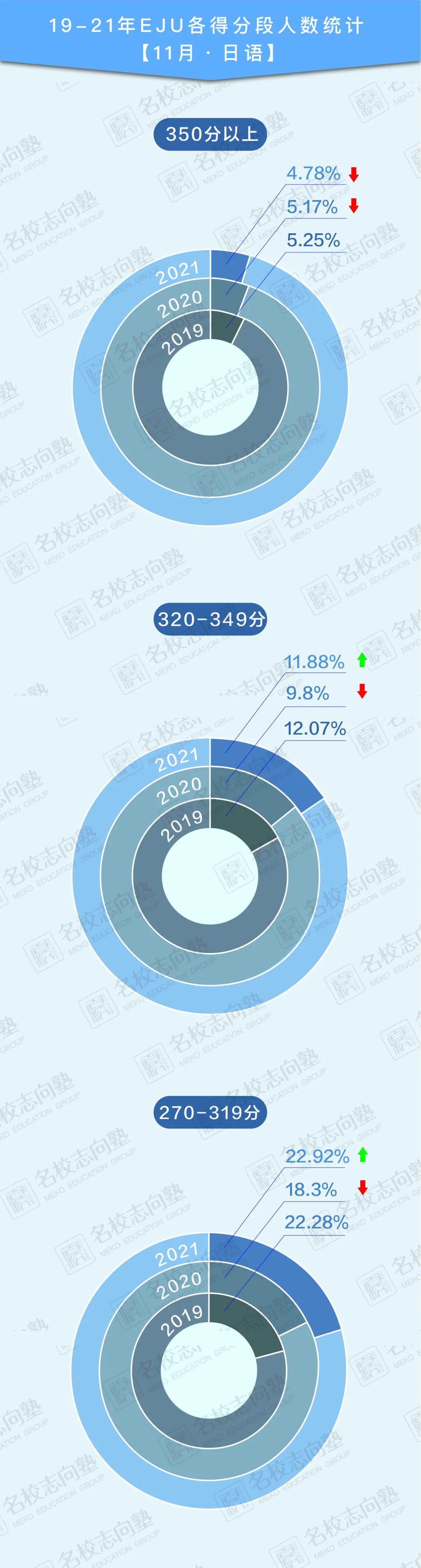 总体来看,近三年350分以上的超高分层人数呈现逐年倒退的态势,且今年的跌幅明显,但由于本年度11月日语的最高分为369分,2019年、2020年的最高分分别为370分和371分,因此,370-379分这一区间人数为0也是情有可原;