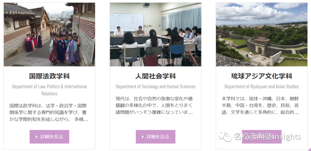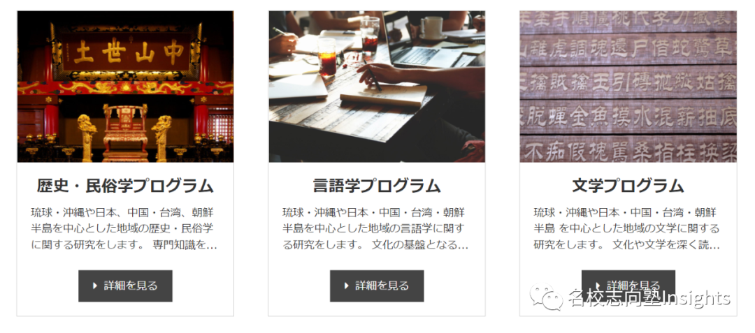 首先,不得不提的就是人文社会学部琉球アジア文化学科,下设历史民俗学program、言语学program和文学program。三者都是围绕琉球/冲绳、台湾、日本、中国、朝鲜半岛相关地域展开,侧重点各不相同。