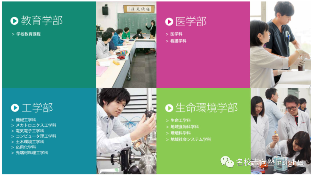 目前设有教养学部、医学部、工学部、生命环境学部4学部,其中医学部在留学生入试中不招生。
