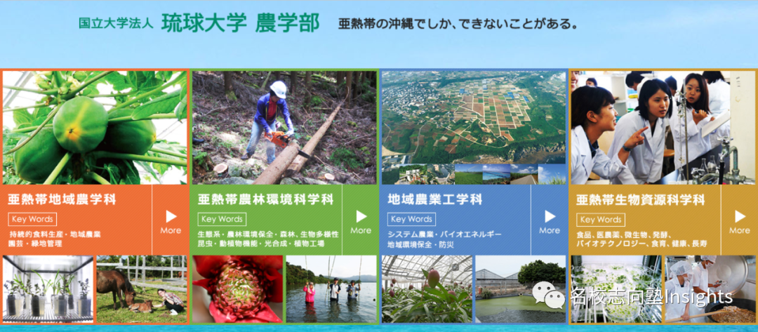 说完地理,我们说气候。像北见工业大学的寒冷地工学一样,琉球大学充分利用 “冲绳处于亚热带季风气候带”这一优势,在农学部设置了亚热带地域农学科、亚热带农林环境科学科和亚热带生物资源科学科。