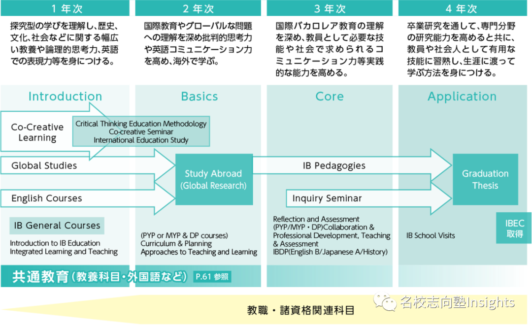 该学科是日本最初的IB教员养成课程,学生通过4年的学习,在取得一定学分并完成申请后即可获得IB教员认定证(IB Educator Certificate in Teaching and Learning)。