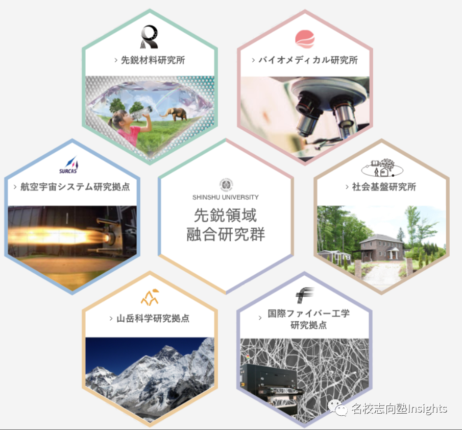 前者包含先鋭材料研究所(以既存的碳素/纤维研究为基础,运用计算科学、化学工学社会学等融合领域知识实现高度系统化的材料学设计研究)、バイオメディカル研究所(进行生命科学、医疗、环境相关的融合研究,以应对超高龄化社会及创造综合生命医学研究革新领域为最终目标)、社会基盤研究所(以data science为线索进行以多文化共生的社会基盘构建为主的融合研究);