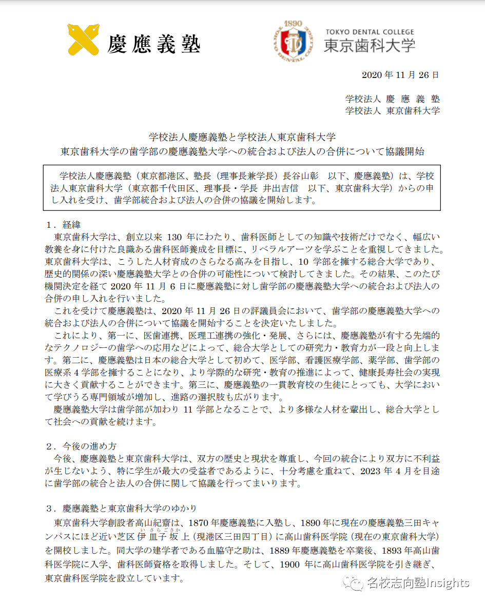 此外,2020年11月,放出了一个重磅消息——庆应义塾大学将于2023年4月与东京齿科大学合并,并签署了学校法人的合并协议。 东京齿科大学,创建于1890年,是一所位于东京千代田区的私立大学,其齿科实力位列日本私立大学顶点,每年的齿科医师国家试验合格率也是名列前茅。届时,东京齿科大学将成为庆应义塾大学的第11个学部——齿学部,有了私立最强齿学部的加持,庆应的实力将达到一个什么样的高度就让我们拭目以待吧!