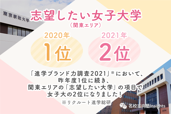首先,在「進学ブランド力調査」(升学品牌影响力调查)中,东京家政大学在关东地区女子大学中连续两年获得TOP 2的亮眼成绩。这就说明,在日本女子高中生群体中,东京家政大学确实是一个非常理想的目标。